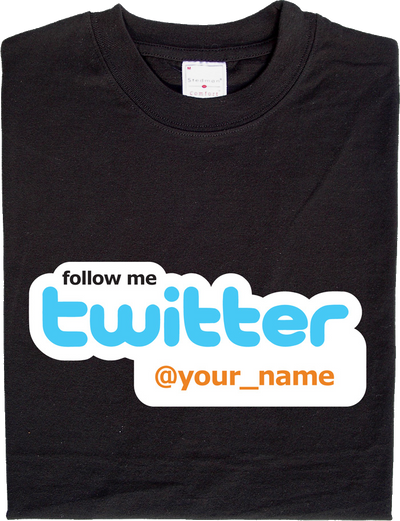 Mit diesem Shirt kannst Du ganz einfach offline Werbung für Deinen Twitter Account machen, denn den Schriftzug "@your_name" ersetzen wir natürlich durch Deinen eigenen Twitternamen. Dazu gib diesen bitte in der Mitteilung zur Bestellung gegen Ende des Bestellvorgangs an.