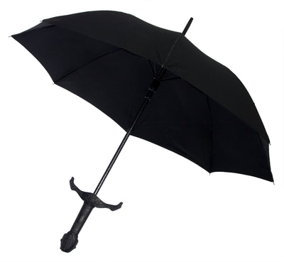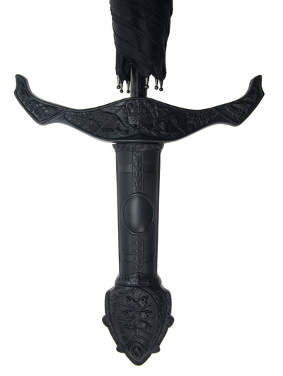 Beim Ritterschwert Regenschirm handelt es sich um einen schwarzen Stockschirm, dessen extra langer Griff wie der eines Ritterschwertes aussieht. Der Ritterschwert Regenschirm ist sehr hochwertig verarbeitet und besteht aus stabilem Plastik, Metall und Stoff. Direkt über dem Griff befindet sich ein Knopf, mit dem man den Schirm automatisch aufspannen kann.