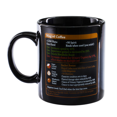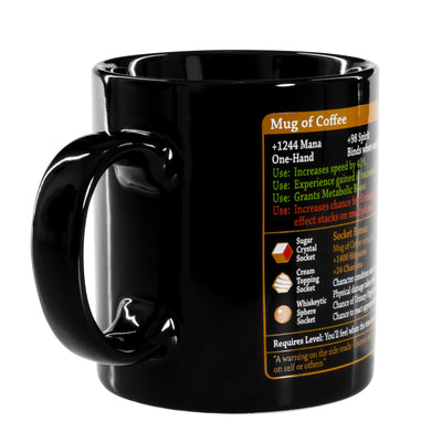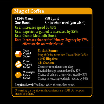 Was sind nun die besonderen Eigenschaften des Mug of Coffee? Zunächst einmal das Wichtigste, +1244 Mana und +98 Spirit. Dass Dein Kopf durch Kaffee schneller wird, ist ja klar. Natürlich verbessert sich die Wirkung durch das richtige Sockeln. Ein bisschen Zucker wirkt Wunder, Whisky hingegen birgt auch das eine oder andere Risiko... Und bedenke: je mehr Kaffee Du trinkst, desto öfter musst Du eine Zwangspause einlegen. ;)