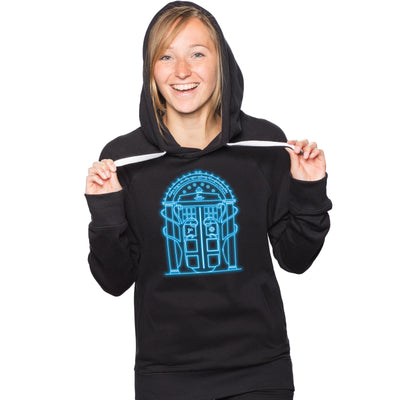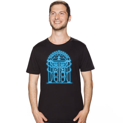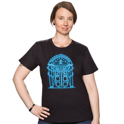 Sprich, Freund und trete ein... in die tardis? Dieses T-Shirt ist eine raffinierte Verschmelzung zweier legendärer Welten: Doctor Who und Der Herr der Ringe. Im Mittelpunkt steht die TARDIS, die Raum-Zeit-Maschine in Form einer altmodischen britischen Telefonzelle, wie sie in Doctor Who verwendet wird. Ihre ikonische Struktur wird hier mit den markanten Elementen des Eingangs zu den Minen von Moria aus "Der Herr der Ringe" kombiniert. Über der TARDIS prangt die berühmte Inschrift auf Elbisch, die vor den Toren von Moria zu finden ist - allerdings abgewandelt, um die Ästhetik des Doctor Who-Universums widerzuspiegeln.