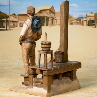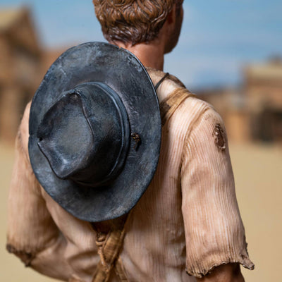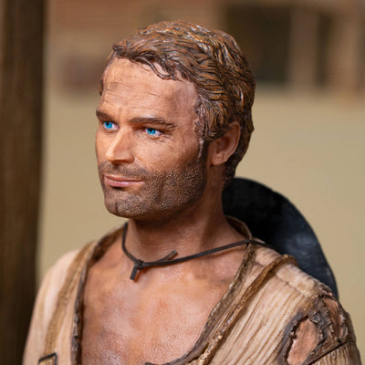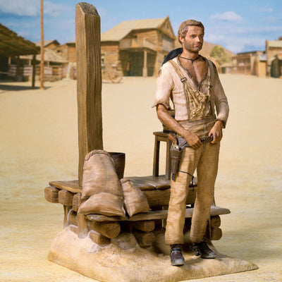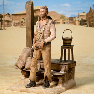 Für Fans des verschmitzten Haudegens Terence Hill gibt es jetzt eine besondere Überraschung: Von der offiziell lizenzierten Terence Hill Limited Edition Sammelfigur gibt es nur 500 Stück und das aus gutem Grund. Denn die extrem detaillierte Figur aus Kunstharz ist beinahe fotorealistisch: Vom Stoff von Hills versengtem Hemd, über die Venen auf seinem braungebrannten Arm bis hin zu den Details des Pistolenhalfters – alles ist bis ins kleinste Detail dem Original nachempfunden. Ganz zu schweigen von der beeindruckenden Größe der Figur, denn sie misst etwa 36 cm. Der blauäugige Troublemaker befindet sich auf einer ebenfalls sehr detaillierten Western-Diorama-Base, die für festen Stand und den passenden Hintergrund sorgt.
