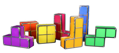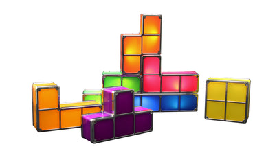 Wie es in Tetris eben so ist, bestehen die einzelnen Bausteine aus jeweils vier Quadraten (ein Quadrat ist dabei 4x4x4cm groß, der 'L' Stein bspw. ist demnach 12cm hoch, 8cm breit). Mit den sieben Blöcken kannst Du dann viele verschiedene Lampenmuster kreieren. Sobald Du den blauen Stein (oft liebevoll Stick genannt) an den Strom angeschlossen hast und der Schalter auf "ON" steht, werden die verbauten LEDs hell leuchten und Deine Welt im Tetris-Glanz erstrahlen! Allerdings nur, wenn sich die Bausteine auch berühren, denn ein Tetrisstein ist nicht gerne allein und sehnt sich nach anderen (und außerdem muss ja auch überall Strom ankommen) ;) Details zu der Funktionsweise haben wir im Blog erklärt :)