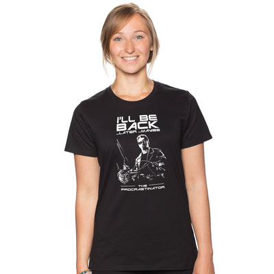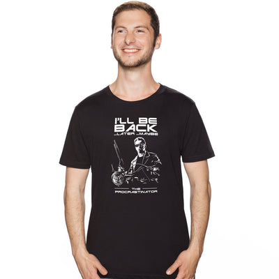 Das "The Procrastinator"-T-Shirt zeigt das ganze Ausmaß der Veränderung: Aus dem markigen "Ich komme wieder" (eng.: I'll be back!) ist ein halbgares "Ich komme wieder... später... vielleicht" geworden. Fehlt nur noch, dass Arnold Schrotflinte, Lederjacke und Motorrad gegen Fernbedienung, Pyjama und Sofa eintauscht...