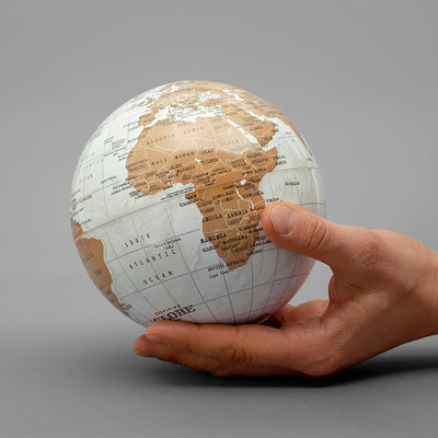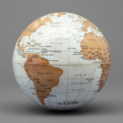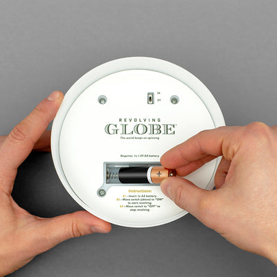 The Revolving Globe - Der rotierende Globus beweist eindrucksvoll, dass sich die Weltkugel definitiv dreht! Sobald Du eine AA-Batterie (nicht enthalten) einsetzt und den Schalter betätigst, dreht sich der kleine Globus für bis zu 30 Tage am Stück! Mit einer Geschwindigkeit von 14 Sekunden pro Umdrehung ist er zwar vergleichsweise schnell unterwegs, dafür schläfst Du beim Zusehen aber auch nicht ein. ;)