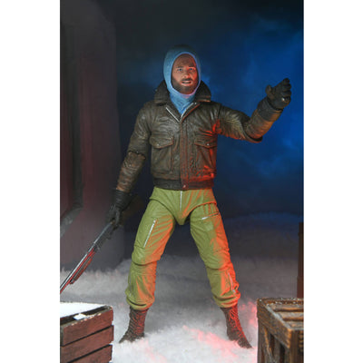 The "The Thing from Another World" MacReady Action Figure is delivered to you in a display packaging with a large window, which looks very good on the shelf. But since it is also movable, you can of course reenact all the film scenes with it. For this purpose, the MacReady action figure comes with a lot of accessories, such as interchangeable hands and heads – depending on whether you prefer the 80s hairstyle or the iconic blue hood.