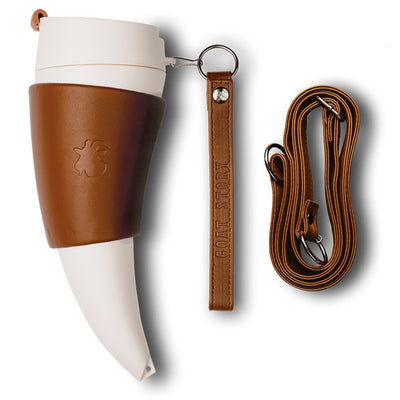 In addition to the drinking horn, you also get a leather handle that will protect your fingers from heat and also serves as a horn stand, and an adjustable carrying strap made of imitation leather that you can use to hang your Goat Mug casually over your shoulder. Unlike drinking horns made from real horn, you can even clean it in the dishwasher. But don't forget to remove the leather parts first ;)