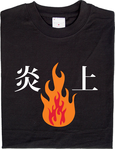 A shirt from our series for Japan fans: The two Kanji (Japanese characters) on this shirt form the word Enjo, which means something like burning, but nowadays is also used to refer to flame wars on the internet. You surely know what a flame war is. If not, you can find more information here.