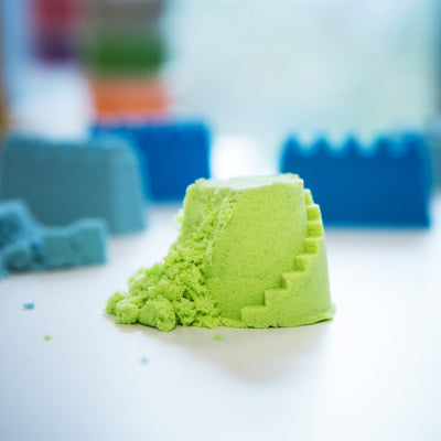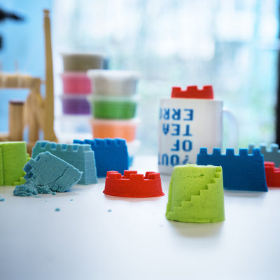 If you leave a sand sculpture standing for a while, it will slowly melt. For a short time, however, Kinetic Sand is stable; you can even cut it with a knife! The special thing about the specially treated sand grains is the haptic, so our pictures can only give you a first impression. By the way, you won’t get wet or sticky fingers.