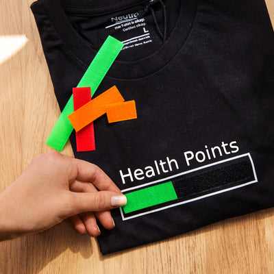 So that the whole world can see at a glance how you are doing, the Health Points shirt provides you with your own portable health bar: In the white-bordered field, you will find a black Velcro strip to which you can attach the colored strips provided. The picture on the left shows the example of the Patience Shirt Patience. The red, orange and green stripes can also be easily shortened with scissors if you want to show a certain number of HP in particular. This lets everyone know how you are doing and which things have a direct effect on your HP.