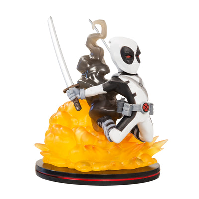 Just like with the Marvel Deadpool Q-Fig. For this high-quality collectible figure, Wade Wilson has donned a special outfit from his days in the X-Force: instead of the classic red, it shines in bright white. So you can see the blood stains better. Or something like that. In addition to Deadpool jumping towards the viewer and brandishing two swords, there is also an explosion replica that connects the crowd favorite with the base.