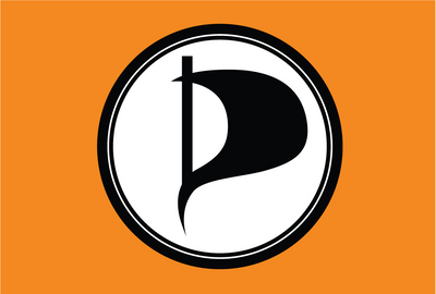 Orange flag with the Pirate Party emblem.