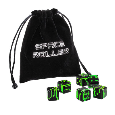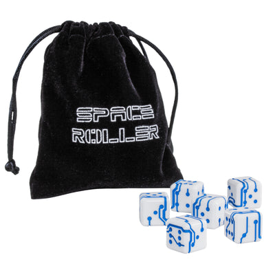 For example, with the Space Roller Dice Science Fiction Dice. This set contains six high-quality W6 dice in a distinctive SciFi design that practically scream to be used in board games or tabletops in the 41st millennium. The dice come in a matching fabric bag. You can be sure: Your friends will turn green with envy and will be amazed! ;)