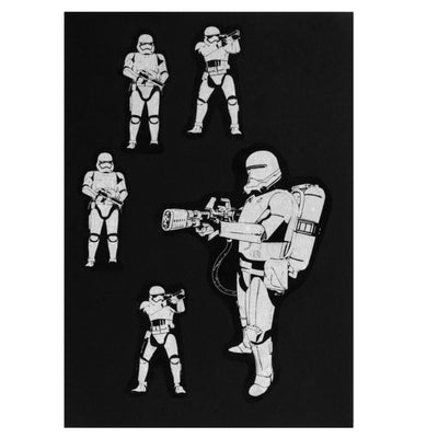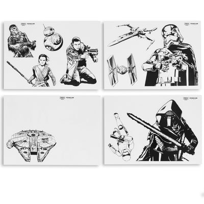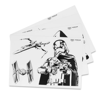 The set contains four sheets with a total of 15 stickers. Among the designs, you'll find spaceships, BB-8, Chewbacca, some Stormtroopers, and more. You can see exactly what on the photos. Here you'll also find some inspiration. Five of the stickers are white and thus suitable for dark surfaces. For orientation: each sheet is 15 x 21 cm in size. The stickers are transparent. If you ever get tired of Kylo Ren on your tablet (which we simply can't imagine), you can easily remove the stickers without damaging the surface. But think carefully: once removed, the stickers cannot be reapplied. By the way, the designs look just as good on all other smooth surfaces. ;)