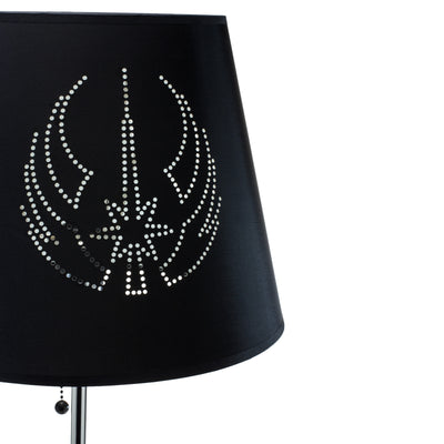 The hilt of the lightsaber is mounted on a heavy metal base that keeps the lamp steady. The black shade is covered with fabric on the outside and white on the inside, providing stylish lighting. :) The emblem of the Jedi Order is stamped three times into the shade, allowing the light to shine through. You turn the lamp on and off with the pull switch.