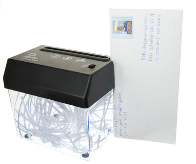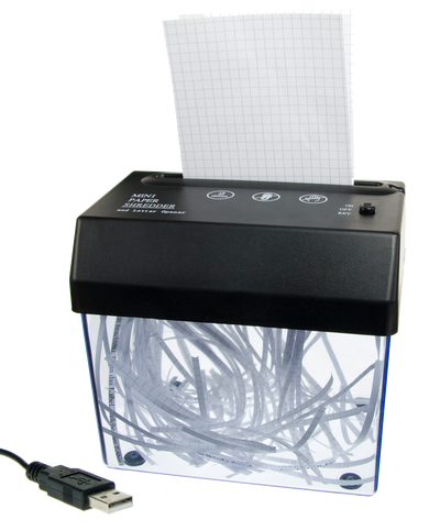 The USB document shredder cuts up to 2 pages at the same time and can accommodate documents up to 12cm wide. It has an optional reverse direction and additionally a letter opener slot.