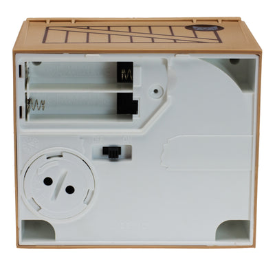 Bien sûr, le chat lui-même ne sortira pas ton argent. Pour cela, tu dois retourner la boîte et ouvrir le couvercle en bas. C'est également là que se trouve le bouton marche/arrêt, si tu veux laisser le chat dans la boîte pour une longue pause ou si tu ne veux pas qu'il accepte de l'argent de la part d'étrangers. (Nous te conseillons toutefois d'encourager le plus grand nombre à essayer cette tirelire inhabituelle...).