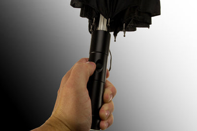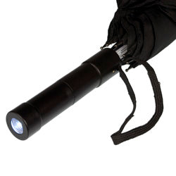 Avec une boucle, tu peux attacher le parapluie à ton poignet (protection contre le vol ;)) ou le suspendre quand tu n'en as pas besoin. Si tu veux changer entre les différents modes d'éclairage, il te suffit d'appuyer sur le bouton du manche : lumière continue, clignotement rapide ou lent sont à ta disposition pour impressionner selon la situation.