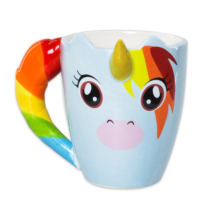 Bien sûr, les animaux mythiques ultimes et leurs fans méritent aussi une coupe ultime : la coupe de l'ultime. Gobelet Licorne arc-en-ciel! Ce gobelet imprimé tout autour brille d'un bleu céleste et montre le portrait d'une vraie licorne, qui fait preuve d'un style à la puissance dix avec sa touffe de cheveux audacieuse et sa queue arc-en-ciel. Mais il y a encore plus à découvrir : L'adorable licorne possède une corne tridimensionnelle qui dépasse du gobelet et qui invite littéralement à y placer des cuillères en équilibre, à y attacher des sachets de thé et à y accrocher des alliances. Comme tu peux le constater, les licornes peuvent également être très convaincantes dans le domaine des objets ménagers.