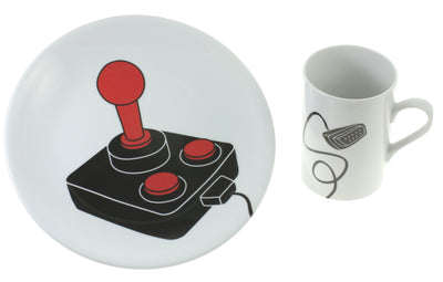 Il se compose d'une assiette et d'une tasse avec l'impression d'un joystick rétro des années 80 (assiette) avec une connexion par câble (tasse). Lorsqu'ils sont placés côte à côte, on dirait que l'assiette est reliée à la tasse par le câble.