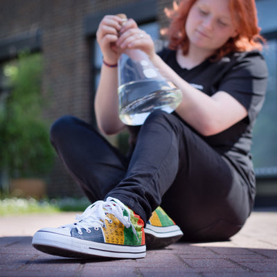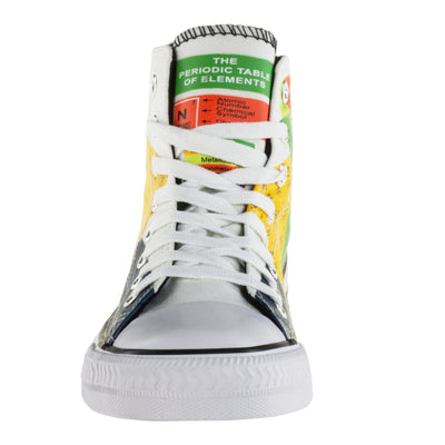 Le scarpe hanno un design classico da scarpe da ginnastica: Suola con bordo largo e chiaro, punta in gomma, caviglia in tessuto, otto occhielli per i lacci. Questo significa che puoi abbinarle con stile a qualsiasi cosa e che vestono i piedi femminili come quelli maschili. La tavola periodica è stampata in inglese intorno al tallone, al piede e alla caviglia. In questo modo, se hai un momentaneo vuoto di memoria, puoi guardare di nuovo le tue scarpe e trovare la strada giusta ;) Tuttavia, non abbiamo ancora testato se i professori di chimica tollerano le scarpe durante gli esami... Vale la pena provare. :)