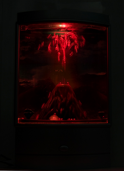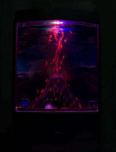 Prima di tutto, devi riempire d'acqua l'involucro del vulcano USB. Poi, premendo un pulsante, il piccolo modello di vulcano all'interno dell'involucro inizia a eruttare piccole sfere di plastica rosse, che poi tornano lentamente a scendere, quasi come la lava di un vero vulcano. Le fasi di eruzione e raffreddamento si alternano: Nella fase di eruzione, i globuli rossi vengono spinti verso l'alto, mentre nella fase di raffreddamento sprofondano di nuovo verso il basso. Inoltre, l'interno dell'involucro si illumina di rosso quando il vulcano è in eruzione e di blu quando si sta raffreddando.