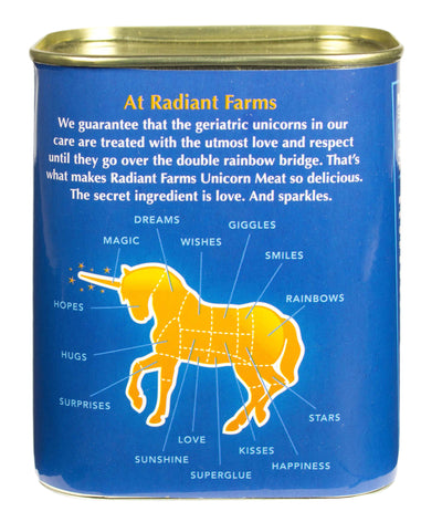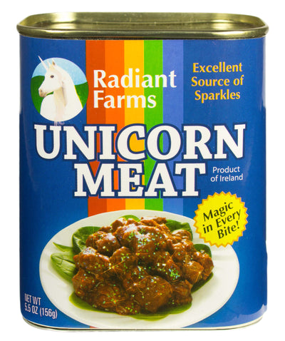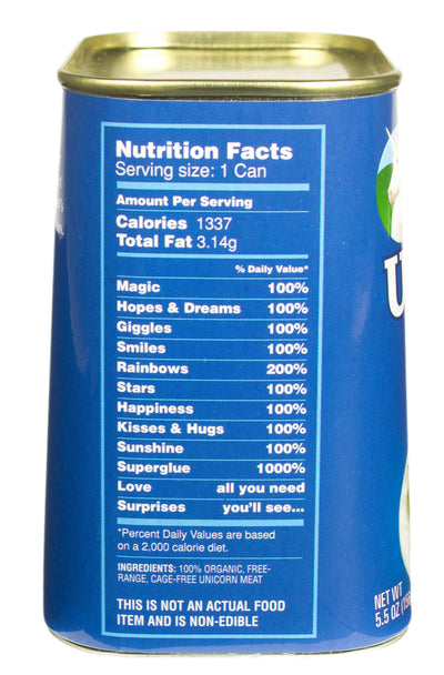 La carne enlatada de unicornio es extremadamente nutritiva y rica en sustancias básicas. Una porción ya cubre todo su requisito diario de magia, esperanza y sueños, sonreír, arco iris y estrellas, besos y abrazos, amor y sol, difícilmente encontrará una comida más saludable y más satisfactoria. Como ni un solo animal tuvo que ser asesinado por la lata de unicornio, incluso es adecuado para vegetarianos.