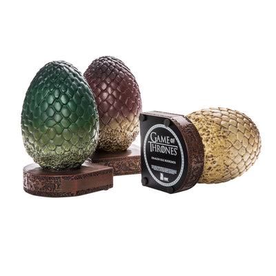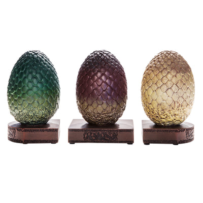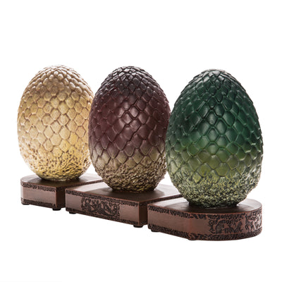 La coloración está modelada por los huevos de Daenerys Targaryen. El huevo rojizo de Drogon tiene su lugar entre los de sus hermanos que Rhaegal (verde) y la visera (crema -con color). Los huevos son fáciles de cuidar porque solo tiene que desempolvar de vez en cuando, pero prefiere no acercarlos demasiado a un fuego abierto. ;)