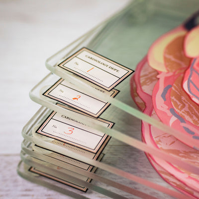 • Set van zes bedrukte glasonderzetters