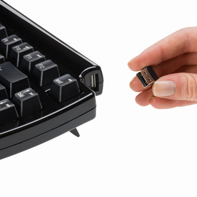 Una batería construida garantiza una larga duración de la batería. Con el uso normal, el teclado solo debe cargarse cada 6-12 meses, con el cable USB suministrado que lleva aproximadamente 5 horas. Si el teclado está conectado a través de USB, las otras 2 conexiones USB se pueden usar para cargar dispositivos, proporcionando una conexión de carga 1A. Desafortunadamente, la transferencia de datos de dispositivos USB conectados no es posible.
