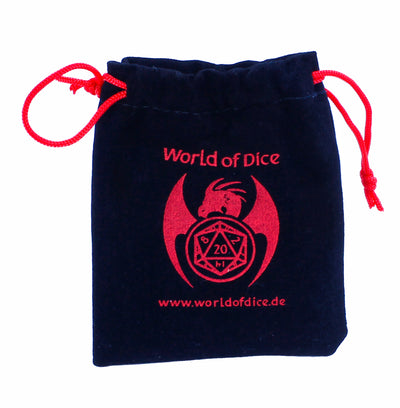 • Ein Beutel enthält sieben schwarze Würfel (W4, W6, W8, W10, W12, W20 und W100) mit farbigen Zahlen