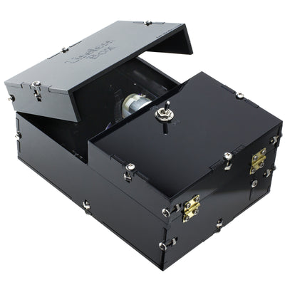 Y ahora todo el asunto nuevamente desde el frente: coloque el interruptor 'On', la palanca sale, la caja se apaga nuevamente. Y otra vez. Y otra vez. En serio, no puedes tener suficiente de eso. Si tiene una obsesión con las palancas en marcha en movimiento, solo volverá a estar en una chaqueta blanca con las mangas en la espalda Caja inútil escapar;)