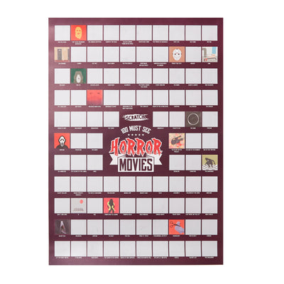 ¡Y eso es exactamente lo que puedes hacer con el póster para rascar „100 películas“ a partir de ahora! Considera este póster simplemente como una lista de tus logros personales en el ámbito de ver películas: Si has visto una de las 100 películas en este póster, puedes rascar el campo de arte correspondiente con una moneda.
