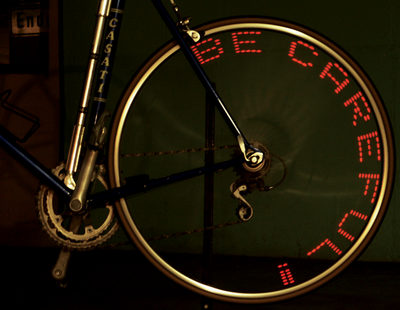 El Mensajero en bicicleta es un pequeño dispositivo equipado con LEDs que se puede fijar entre los radios de una bicicleta. Tan pronto como se va más rápido de 6 km/h, se muestra uno de los 6 mensajes preestablecidos, la velocidad actual o incluso un mensaje propio de hasta 13 caracteres. La visualización se realiza mediante LEDs parpadeantes alternantes según la posición del dispositivo. La inercia del ojo crea la ilusión de un texto constante.