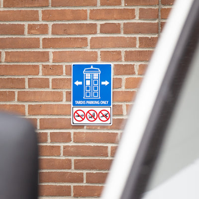 Porque así Señal de estacionamiento de la caja de llamadas de la policía " ¡Ocupado, el mercado de los espacios de estacionamiento de Time Machine también está altamente disputado y regulado! Este letrero de chapa dice, por ejemplo, que solo la TARDIS, una máquina del tiempo de una serie de televisión británica sobre médicos, puede estacionar. Otras máquinas de tiempo conocidas, como las copias que se muestran a continuación, no deben estacionarse aquí. En ningún momento. A menos que viaje de vuelta en el tiempo y estacione allí antes de que se estableciera el letrero ...;)