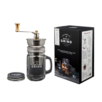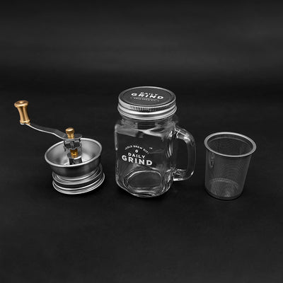 Y con el Daily Grind - Kit de cerveza fría para amantes del café ¿Puedes preparar esta especialidad de café en casa? En el set encontrará todo lo que necesita aparte de los granos de café para la preparación: un vidrio de jar masón con manija, un molinillo de café con rosca de tornillo, un inserto de filtro y una cubierta de tornillo.