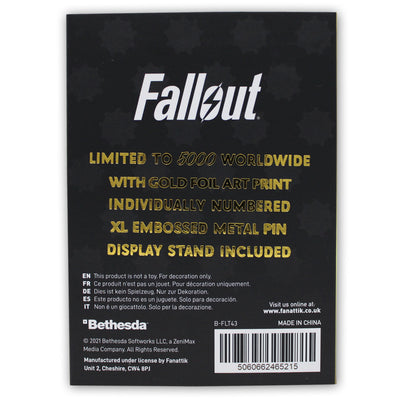 Este pin dorado en forma de casco de Armadura Potenciada demuestra qué tan fiel fanático del mundo de Fallout eres. En el soporte incluido, este buen pedazo está seguro y puede ser exhibido adecuadamente junto con la impresión artística con lámina dorada también incluida. La edición del pin está limitada a solo 5,000 piezas.