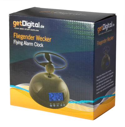 El reloj despertador volador tiene una hélice que vuela en el aire cuando suena la alarma. La alarma solo se puede apagar recogiendo la hélice y volviéndola a colocar en el reloj. Así que levantarse está garantizado :)