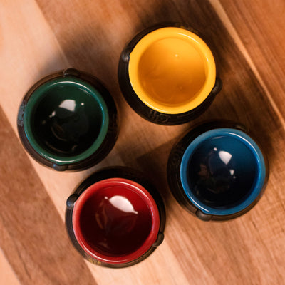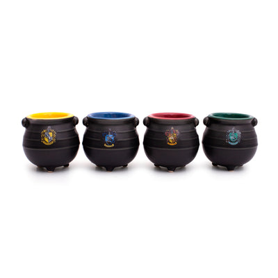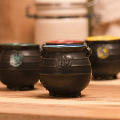 Y tenemos las copas correctas: que Harry Potter Magic caldera espresso set ¡Consiste en 4 pequeñas tazas de café espresso de cerámica que se parecen a la caldera de las lecciones de pociones mágicas en la escuela para brujería y magia! Cada taza de una de las casas de Hogwarts representa el color característico y el pequeño escudo de armas en el exterior. Además, cada mini hervidor lleva el logotipo oficial de Harry Potter.