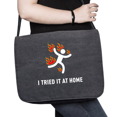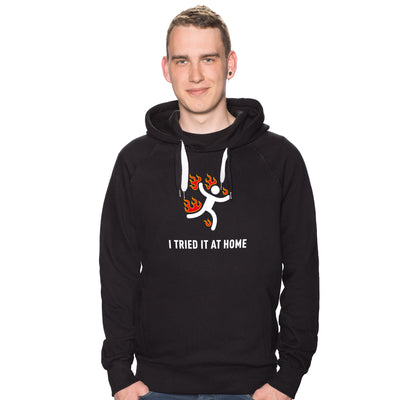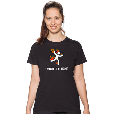 Y lo de intentarlo... bueno, mira tú mismo: La camiseta "Lo intenté en casa" te muestra de manera bastante drástica lo que puede pasar si intentas experimentos de la televisión o de Internet: podrías prenderte fuego espontáneamente y luego correr gritando por ahí. Pero hablando en serio: por favor, ten cuidado de no herirte al experimentar en casa. 5 minutos de fama en Internet no valen la pena poner en riesgo tu vida y tu integridad física. :)