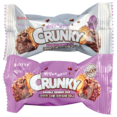 Lotte Crunky Double Crunch Barrita de Chocolate está hecha de crema de cacahuate, cereales inflados y caramelo, y está cubierta con chocolate y una cobertura de cacahuate.