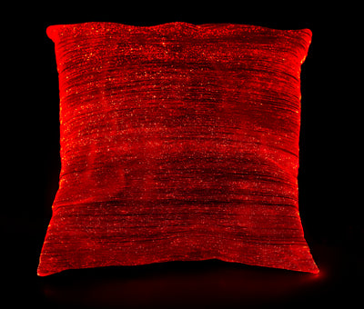 El fabricante de esta almohada también aprovechó esta propiedad. El textil especial que adorna esta almohada está hecho en gran medida de fibras de vidrio*), que están iluminadas por LED. Al pesar, las fibras de vidrio de la oblea se mantienen retorcidos a propósito. Por lo general, puede ver una luz inteligente casi solo donde sale por plásticos de fibra óptica. En los puntos donde las fibras de fibra se torcían, la luz parece todo el efecto de luz más brillante y selectivo.
