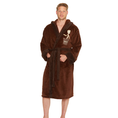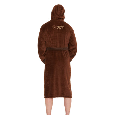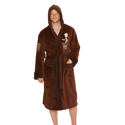 Pero volvamos a las cosas que realmente importan: Esta bata, a diferencia de su homónimo con corteza, no está hecha de corteza de árbol, sino de una tela suave y acogedora y cuenta con una capucha y un cinturón. Los parches en el pecho, la espalda y el brazo muestran al adorable Baby Groot, su nombre como inscripción y el logo de Guardians of the Galaxy. Vestido así, estarás completamente preparado para el largo camino al baño o una noche relajada frente al televisor. Y si además quieres darle una lección a Thanos, la bata también te servirá de gran ayuda! ;)