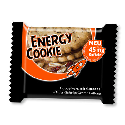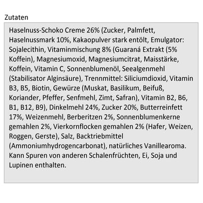 Oculto entre las dos mitades de una deliciosa galleta doble, una crema hecha de avellanas y chocolate te espera, que contiene 45 mg de cafeína por galleta. ¡Esto corresponde aproximadamente a una taza completa de espresso! Finalmente puedes despertarte sobre la marcha sin tener que recurrir al café y similares. Por supuesto, también puede sumergir la galleta en el café si le gusta el café. Y prepare el café directamente con bebida energética en lugar de agua ... (aparte del hecho de que esta combinación sabría horrible, le recomendamos que lo pruebe en casa por razones de salud).