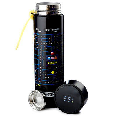 Für alle Fans dieses Kult-Games haben wir deshalb hier die Pac-Man Trinkflasche mit Digital-Thermometer. Darauf zu sehen ist das schlichte Design des Spiels mit allen wichtigen Charakteren. Während der Highscore scheinbar bei 0 Punkten stehen geblieben ist, gibt es mit Sicherheit einige Punkte für die Kühl- und Warmhaltefunktion der Flasche. Ob Eistee oder Kaffee – kalte Getränke behalten ihre Temperatur bis zu 24 Stunden lang, warme immerhin ca. 6 Stunden. Eine genaue Temperaturangabe findest du in digitaler Form auf dem Deckel.