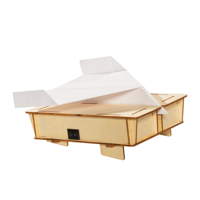 Bien con el Rampa de arranque de aviones de papel ¡naturalmente! En este kit de madera, encontrará todos los componentes necesarios para hacer una estación de salida operada por la batería para su flota de papel. La asamblea va rápidamente de la mano y en poco tiempo puede defender su soberanía. Tan pronto como haya insertado cuatro baterías AA (no incluidas) y presione el interruptor en el costado de la rampa inicial, dos motores aceleran el objeto de vuelo de su elección y deja que azote el aire a través de la ventilación. ¡Ahora depende de usted desarrollar el plano de papel perfecto!