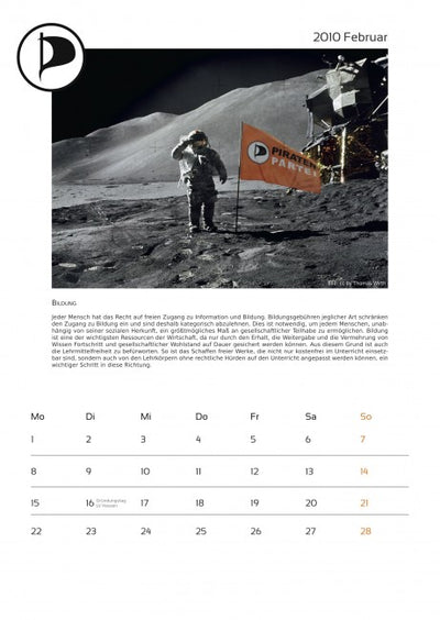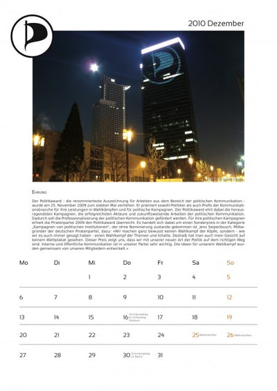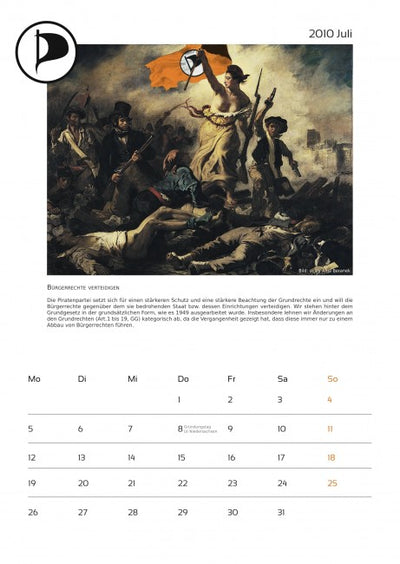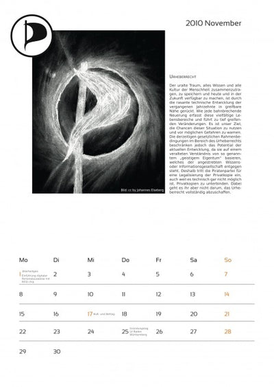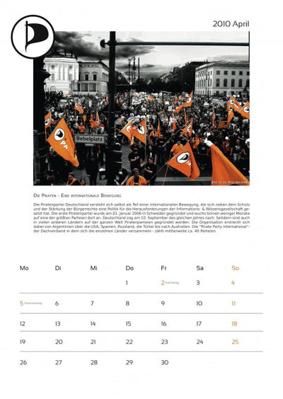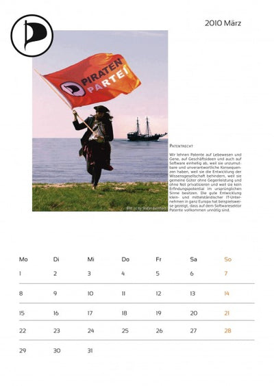 Cada mes está acompañado de una imagen pirata y un texto sobre temas piratas, y el calendario ya incluye algunas fechas importantes para los piratas. Un aviso más: en octubre, lamentablemente, se olvidó mencionar a la empresa que proporcionó fuertemente subvencionada la máquina de proyección a los piratas. Por lo tanto, aquí una vez más el agradecimiento a Oliver Bienkowski de Lightartist.