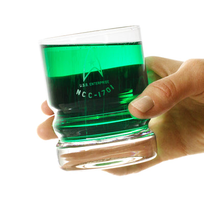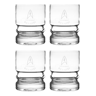 Los cuatro vasos muestran el emblema de la Flota Estelar y el nombre de la USS Enterprise en impresión plateada. En la parte inferior se puede ver el logotipo de Star Trek. Con dos ranuras y un bonito pie grueso, los vasos se sienten cómodos en la mano. Perfectos para agitar con estilo el whisky... o el jugo de manzana. ;)