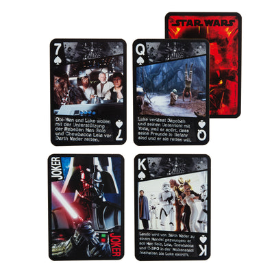 Las cartas de juego de Star Wars "La historia de Darth Vader" cuentan en las 52 +3 cartas de una baraja de póker con imágenes y textos breves cómo el joven Jedi se convierte en Darth Vader, lucha contra su hijo Luke y finalmente [SPOILER] vuelve al lado bueno. Las cartas de juego se entregan de manera elegante en una caja que imita el icónico casco de Darth Vader. Hablando de eso: ¿Se considera hacer trampa usar la Fuerza en el póker? ;)