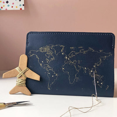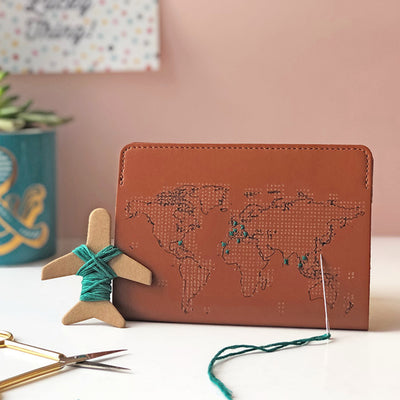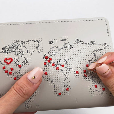 Afortunadamente, se ve muy diferente Puntada: la cubierta del pasaporte para bordado De: Este caso no solo protege su pasaporte de los signos de desgaste, ¡sino que también puede ser bordado! En el mapa mundial que se puede ver en el caparazón, puede marcar todos los países y lugares ya viajados con una puntada y, por lo tanto, "verificar" todo el mundo poco a poco.