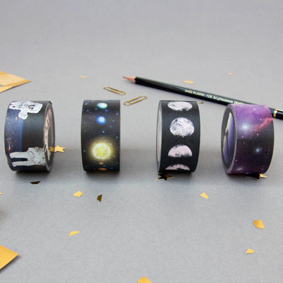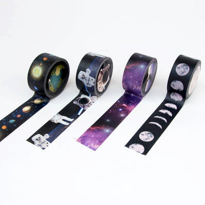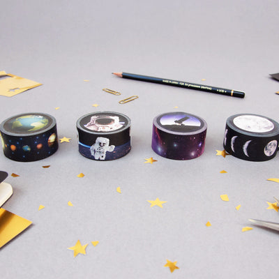 Solche extremen Situationen wirst du mit dem Weltraum Klebeband hoffentlich nicht lösen müssen. Wenn Geschenke eingepackt, Kalender oder Notizbücher dekoriert oder sonstige Alltagsprobleme gelöst werden müssen, kann aber auch dieses Klebeband die Rettung sein. Ein Set enthält gleich vier spacige Motive, wie Astronauten, Sterne oder die Mondphasen.
